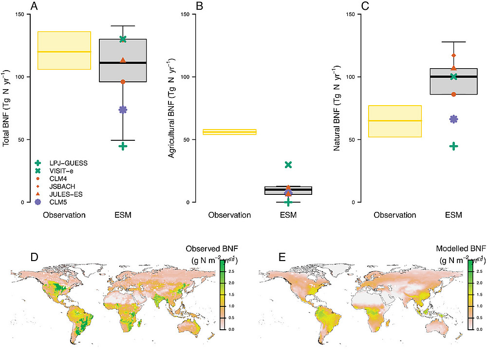Comparison between empirical and modeled present-day terrestrial BNF. (A) Total, (B) agricultural, and (C) natural global BNF from a new empirical BNF synthesis (26) and ESMs (averaged over 1995 to 2014). ©Bettina Weber
